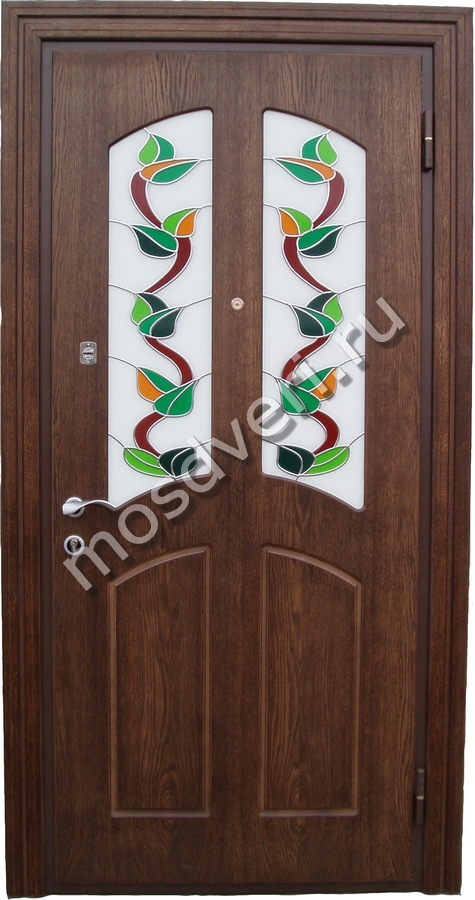 Входная дверь с отделкой массивом с симметричными витражами — сочетает в себе стильный внешний вид и высокую надёжность.