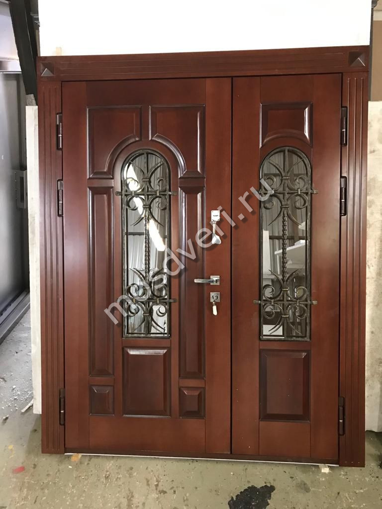 Элитная входная дверь коричневая двустворчатая со стеклом — совмещает стильный внешний вид и максимальную защиту.