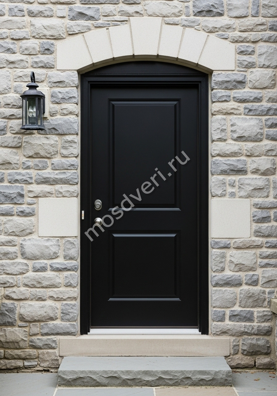 Высокая входная дверь в частный дом черного цвета — совмещает современный дизайн и превосходные защитные характеристики.